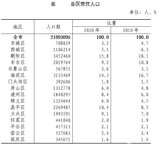分区域来看,北京中心城区(东城、西城、朝阳、海淀、丰台、石景山)常住人口为1098.86万人,占全市比重为50.2%,其他十区(门头沟、房山、通州、顺义、昌平、大兴、怀柔、平谷、密云、延庆)的常住人口为1090.45万人,占比49.8%。