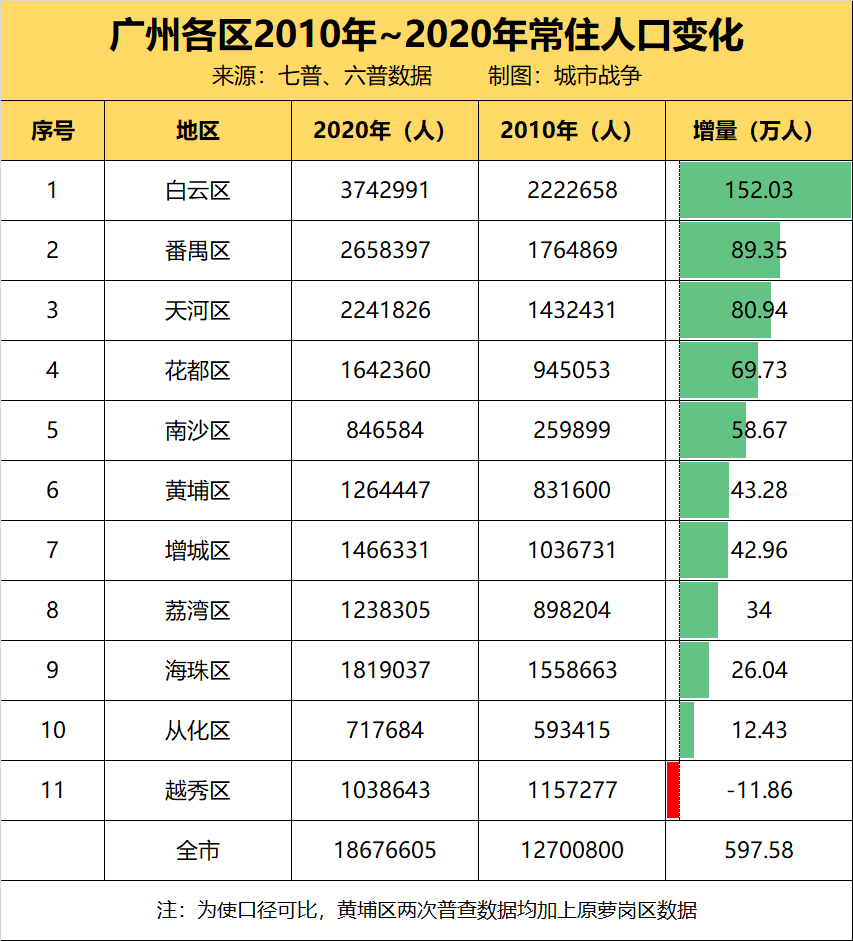 2020,广州常住人口为1867.66万人,是我国第三大人口城市,10年净增597.58万人,增量超过北京、上海,少于深圳。