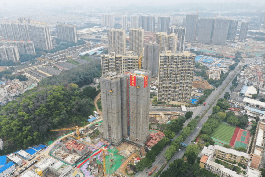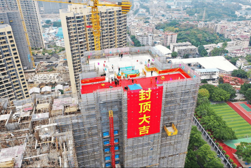 12月28日上午,茅岗路以西改造项目西华片二期复建房举行封顶仪式。鱼珠街道、茅岗社区、项目公司等改造工程相关负责人到达32层楼顶共同为西华片二期复建房浇筑最后一方混凝土。