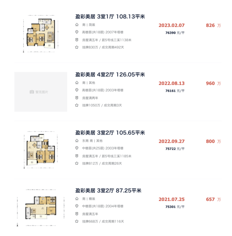 有网友在网上发图称,近两周盈彩美居成交9套二手房,成交均价在3-3.76万元/㎡不等。