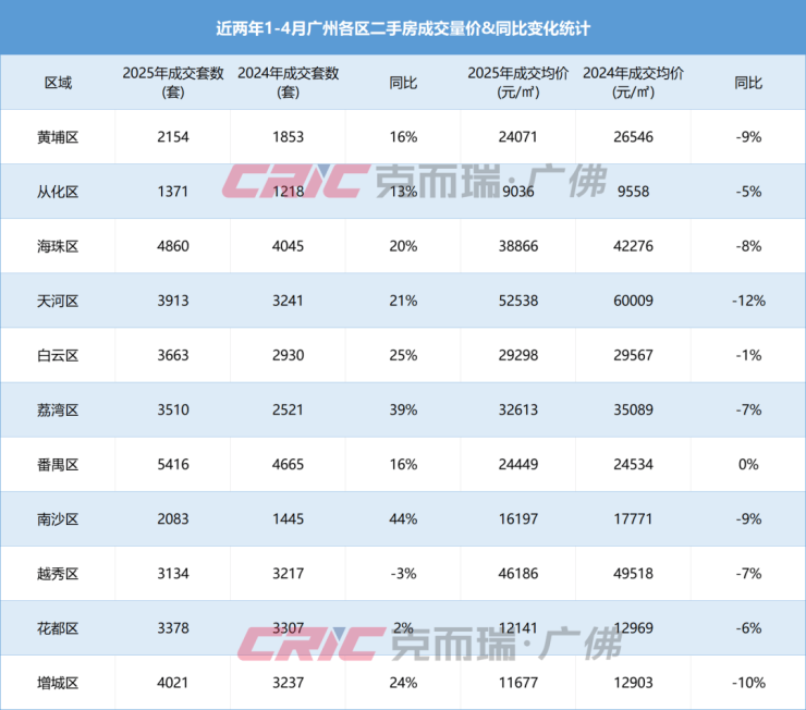 扩大范围看全区的成交情况,克而瑞数据监测显示,今年1-4月天河区二手房成交均价52538元/㎡,同比下跌12%,为全市最高。