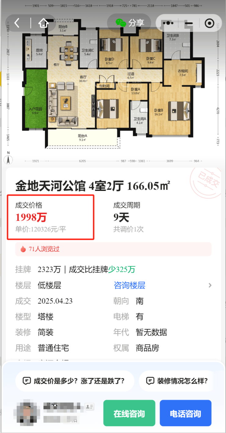 例如在4月末牛奶厂金地天河公馆,成交一套建面约166㎡四房户型,总价1998万,折合均价约12.03万/㎡。