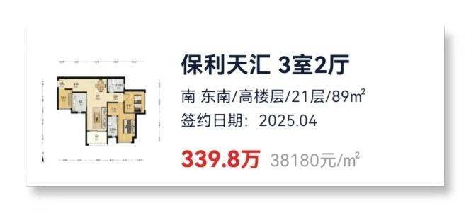 以保利天汇为例,根据最新的成交记录,保利天汇成交一套89㎡次新房,总价339万元,折合单价约3.8万元/㎡,创下了该小区截至目前最低成交均价记录。