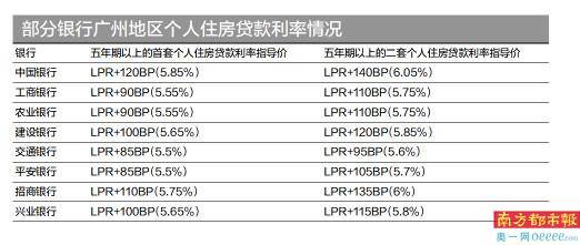 南都记者获悉,目前广州地区大行房贷首套利率指导价在85BP-120BP,利率在5.5%-5.85%;二套房贷利率大多上涨105BP-140BP,利率在5.7%-6.05%。