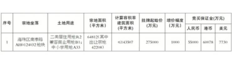 海珠区南泰路AH0124032地块(即翠城花园东地块)正式挂牌,起拍总价27.5亿元,起拍楼面价1.9万元/平。