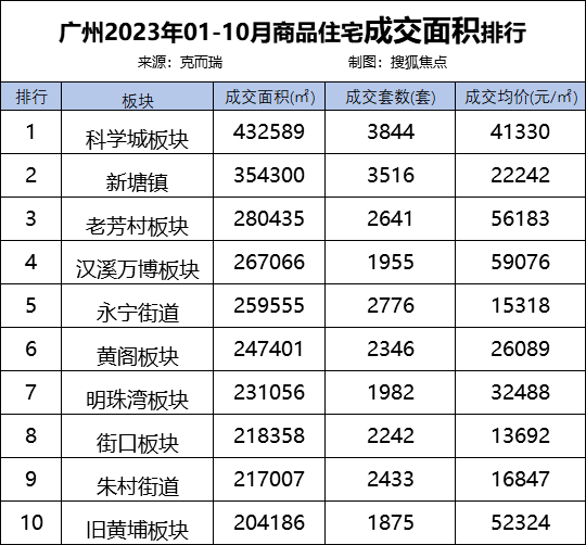 根据克而瑞数据显示,在2023年前10月,广州卖得比较好的top区域(按照成交面积排行)主要集中在科学城、新塘、老芳村、汉溪长隆等板块。