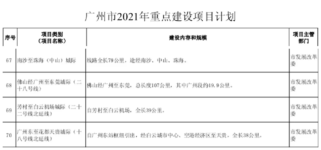 近日,广州市发展和改革委员会正式对外公布《广州市2021年重点建设项目计划》。其中,四个城际轨道交通项目进展加速,列入今年的建设计划。分别是: