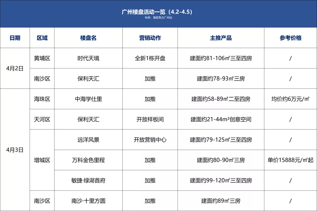 尽管如此,这个4月,各大楼盘还是看点十足。据搜狐焦点广州站、中地行不完全统计,全市约26盘有营销动作,涵盖开放营销中心、开放临时展厅、开放样板间、开盘与加推新货等。