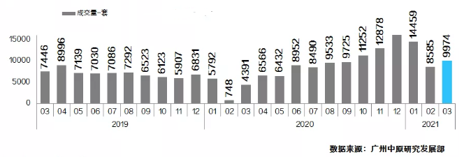 先来看一组数据,据广州中原研究发展部统计数据显示,在过去的3月,广州一手住宅网签达 9974宗,虽然环比2月上升16%,但对比1月则下跌了31%。