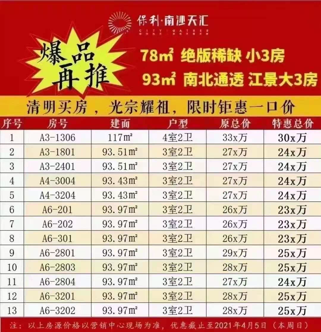 保利天汇(南沙),为南沙亭角村旧改项目,是继保利天悦(海珠琶洲村旧改项目)、保利天汇(天河小新塘旧改项目)后,打造的第三个“天”字系高端住宅项目。4月2日,该项目加推建面约78-93㎡三房,同时推出清明假期特惠一口价单位,分分钟省下几十万哦。