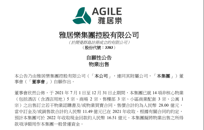 1月10日,雅居乐公告披露,其于2021年7月1日至12月31日止期间,已就14项非核心物业的出售订立若干物业认购书及/或物业买卖合同,售价合计约人民币28亿元,当中订金及/或销售款合计约人民币11.49亿元已在2021年收取。