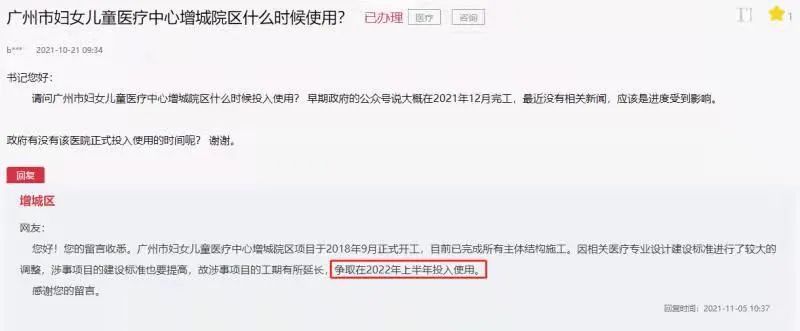 值得注意的是,广州市妇女儿童医疗中心增城院区基本完工,据留言板回复,该项目预计在2022年上半年投入使用。