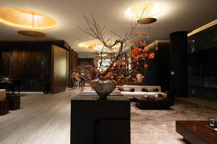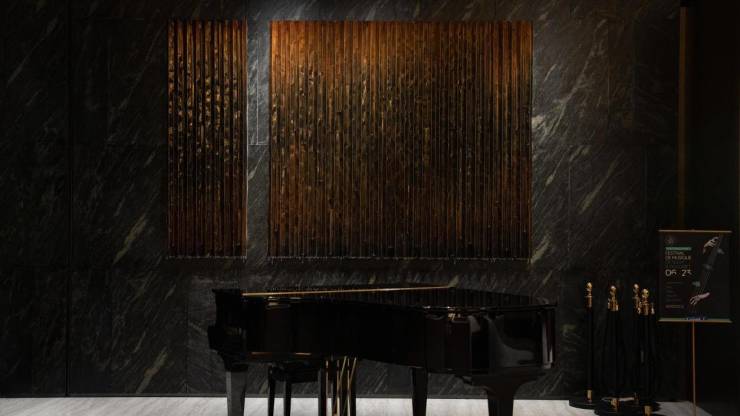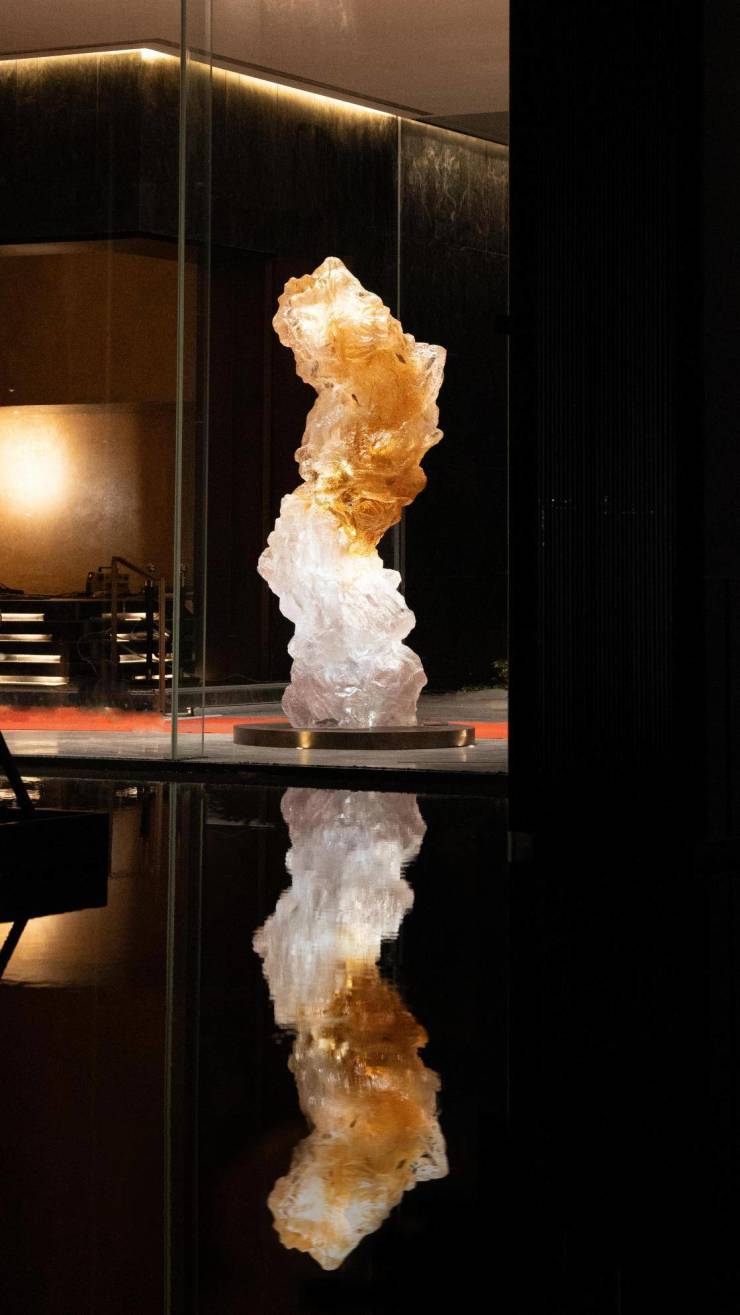 沿一座金属肌理的艺术楼梯曲折向上,天幕顶光倾泻而下,仿佛在森林中仰望天空的瞬间,穿过树荫的光洒在身上,融合艺术带来的戏剧性冲突,让人真切感受到自然带来的震撼仪式感。