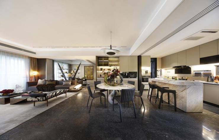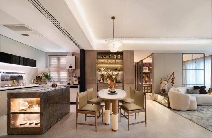 开放式厨房/餐厅架构,配备了岛台,整体增强了家人在各空间的情感交互性,也同时满足中厨+西厨+餐厅的使用需求。