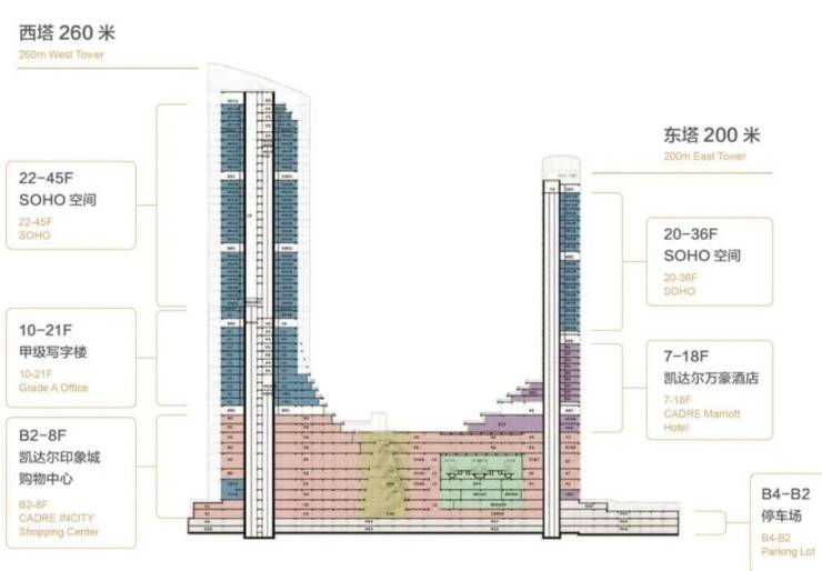 项目建筑总面积36万㎡,由高260米46层的主塔楼(西塔)、高200米36层的副塔楼(东塔)、4层地下室以及8层裙楼组成,集大型购物中心、写字楼、五星级酒店、SOHO(小型办公室)于一体。