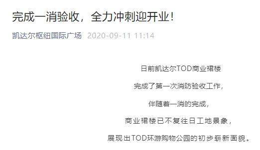2020年9月,凯达尔枢纽国际广场官微发文,项目商业裙楼完成了第一次消防验收工作,各品牌商户将于9月15日陆续进场装修。全国首个“TOD环游购物公园”——凯达尔印象城迎来冲刺阶段,即将精彩亮相!