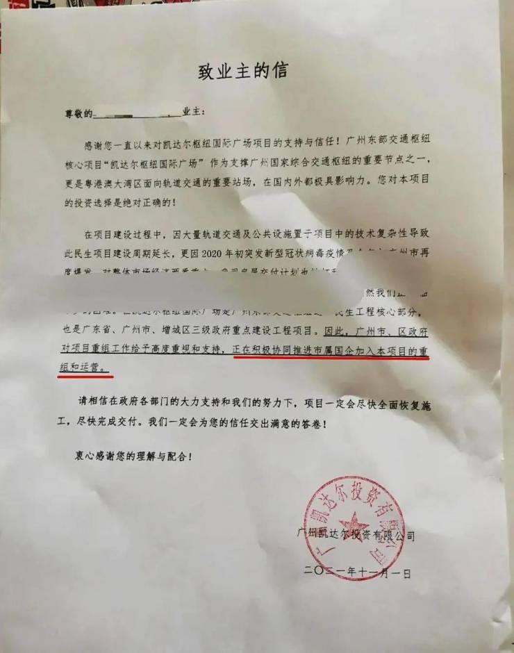 2021年11月,一份广州凯达尔投资有限公司发出的《致业主的信》在网络流传,并且强调:“广州市、区政府对项目重组工作给予高度重视和支持,正在积极协同推进市属国企加入本项目的重组和运营。”并表示“项目一定会尽快全面恢复施工,尽快完成交付。”