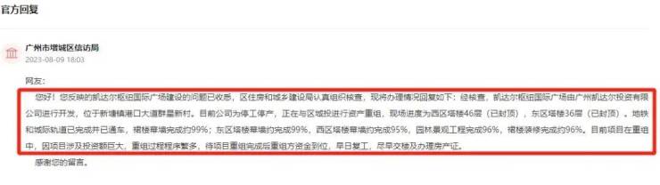 2021年8月,凯达尔枢纽国际广场官微就项目风波进行正面回应,称项目正在与广州市意向企业进行重组,进展顺利。