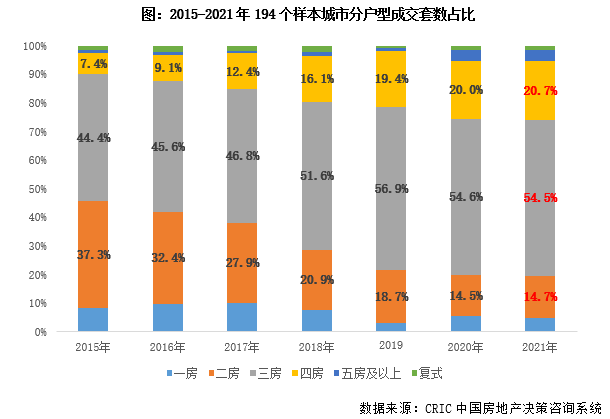 受限贷政策影响,大量改善性需求被压制。2021年,改善性需求相对坚挺,据CRIC重点监测的 194个样本城市成交结构数据显示,三房成交套数占比高达54.5%,四房成交占比稳步提升至20.7%。但受限贷政策影响,不少城市二套房首付比例都在50%以上,部分城市更是达到70%乃至80%,很大程度上提升了改善性客群首付款支出压力,大量改善性需求被压制。