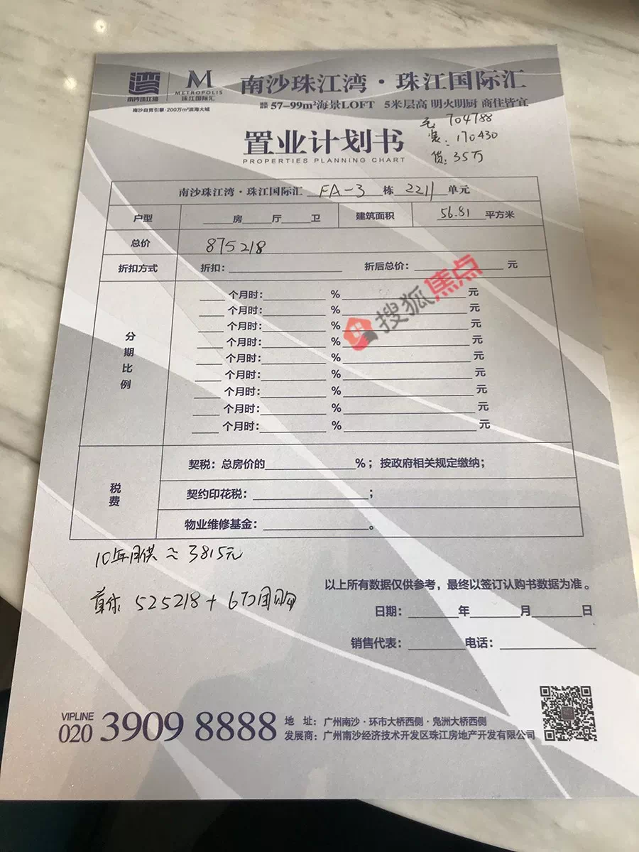 现场销售为血拼妹算了一套总价为87.5万的56平米一口价单位,首付5成,即52.5万+6万团购费(99平需9.5万团购费),10年月供3815元。