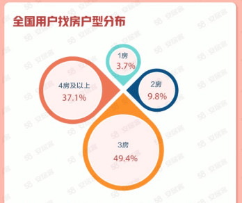 值得关注的是,5月,全国新房市场3居室找房热度较高,占比49.4%;4居室及以上户型找房热度占比持续增长,占比达到37.1%;2居室找房热度占比9.8%;1居室找房热度较低,仅占比3.7%。
