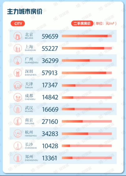 报告显示,5月全国65个主要城市二手房挂牌均价为16887元/㎡,环比下跌0.10%,65城中有26城二手房挂牌均价环比上涨。北京、深圳、上海二手房挂牌均价分别为59659元/㎡、57913元/㎡和55227元/㎡。