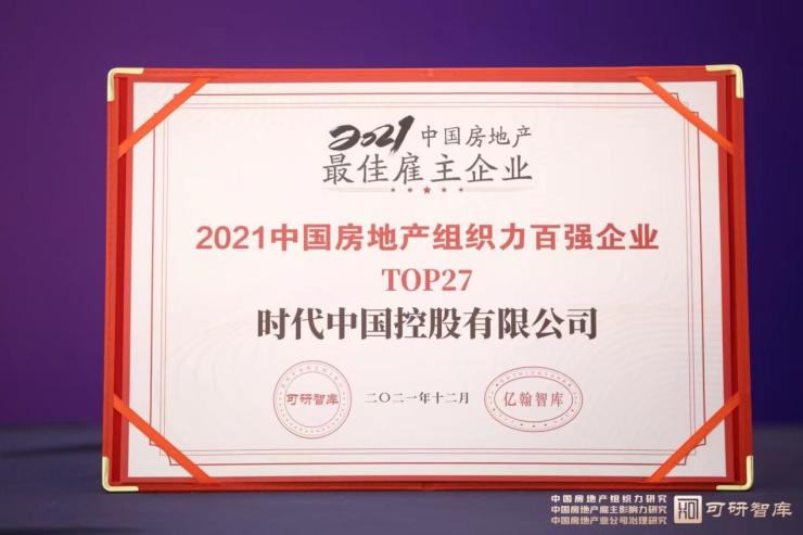 时代中国凭借优秀的组织力表现和雇主品牌影响力,荣获“2021中国房地产组织力百强企业(TOP27)”,并蝉联“2021中国房地产较佳雇主企业”。