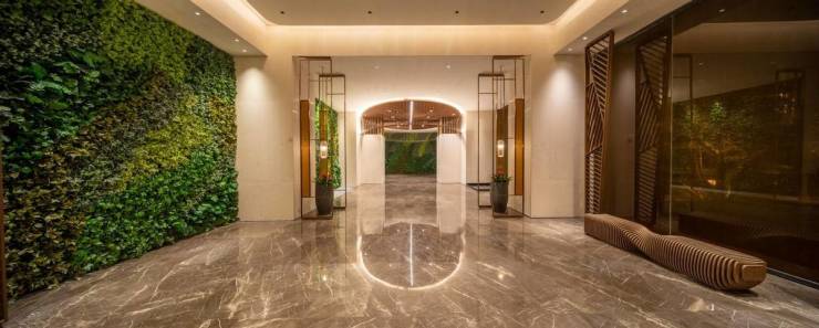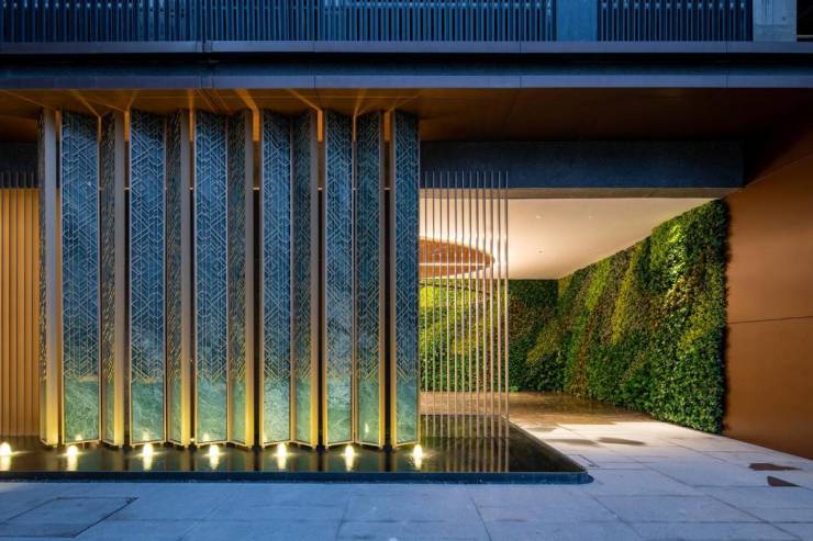 阔朗入口采用石材、玻璃、绿植造景等,尽显归家仪式感。