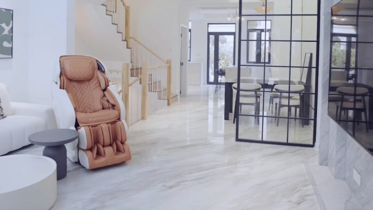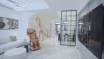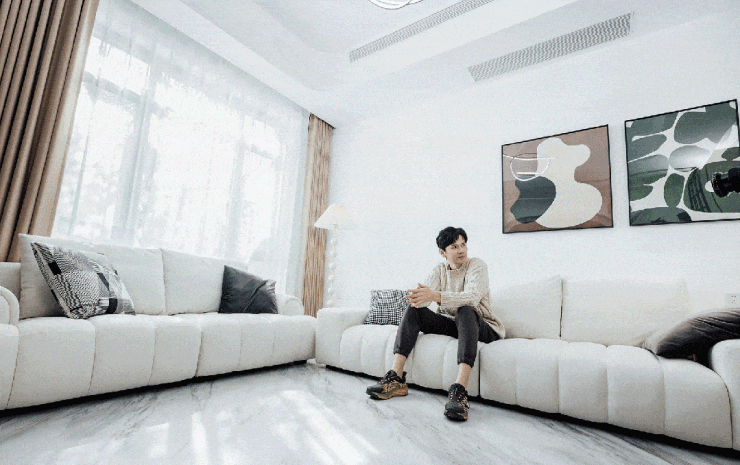 为了达到鲍春来以及母亲所期待的“白色”、“简约”的风格,设计师在一楼客厅、餐厅的地面、电视背景墙都选用了极具东方韵味的华珍岩板东方既白,让中国大美融入冠军家。