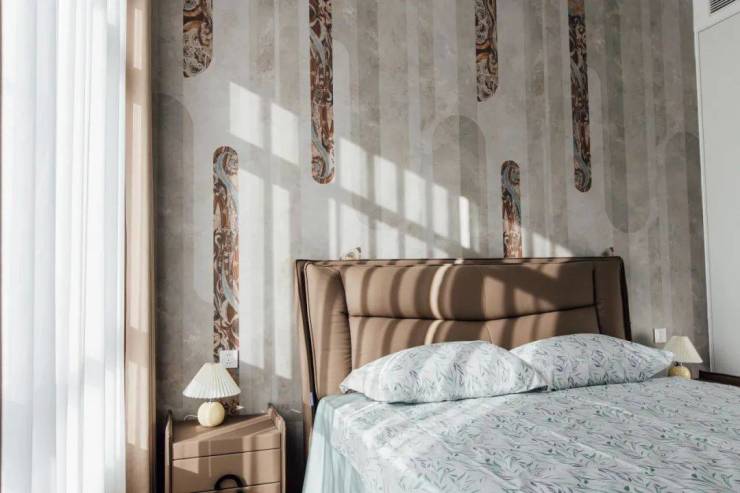在了解到鲍春来母亲对中式风格的偏爱后,设计师选用了极具中国文化韵味的饰材——冠珠华脉岩板-敦煌印象。冠珠华脉岩板,致力以陶为根、以城为脉,以岩板为载体让中国文化走进千家万户。冠珠华脉-敦煌印象-飞天岩画,灵感取材于敦煌传承千年、精美绝伦的文化图腾——壁画,辅以几何拼接创作,打造出别具一格的新东方美学风格。2600×800mm规格,一片上墙到顶,避免加工,安装省心的同时更是恢弘大气。