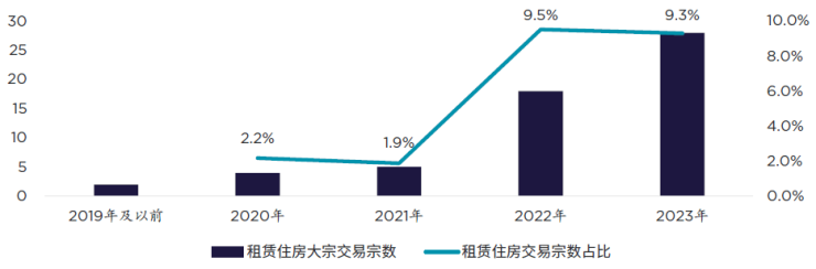 近年来租赁住房大宗交易宗数及宗数占比