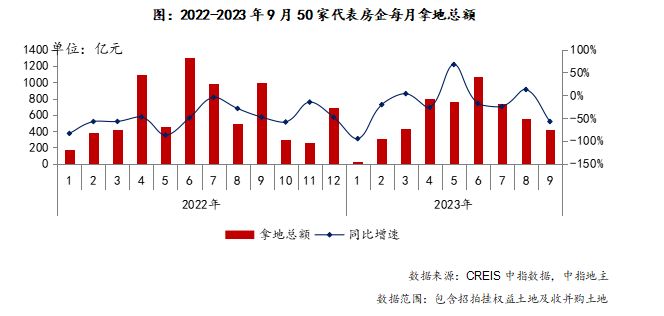 值得关注的是。从刚刚过去的9月土地市场来看,受热点城市供地和上年低基数的影响,企业拿地规模同比大幅下滑。据中指研究院统计,今年9月,50家代表房企拿地总额同比下降57.5%,环比下降24%。