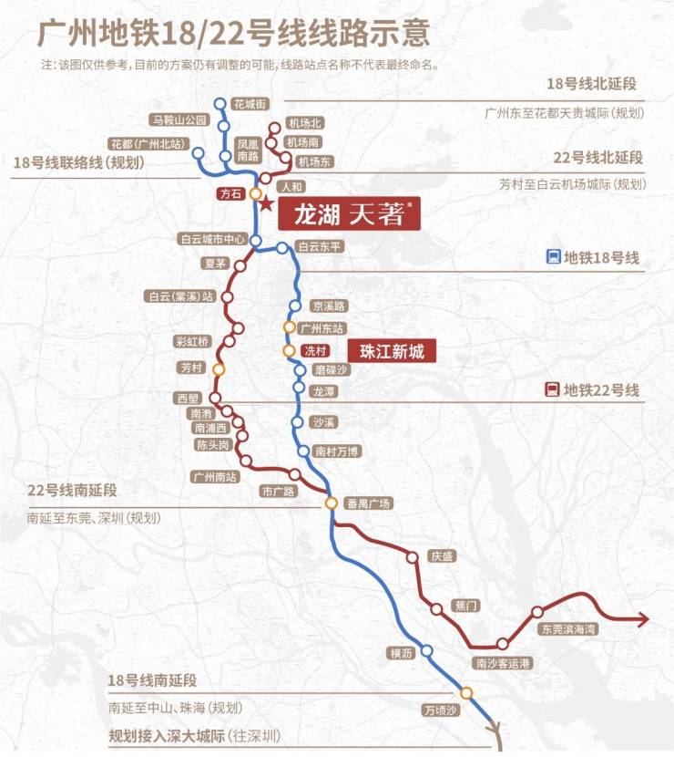 据了解,龙湖天著紧邻湾区大动脉,双高速地铁18/22号线北延线“方石站”(目前18号线首通段已经通车,北延段已经动工建设),未来从项目出发,2站嘉禾望岗,经18号线五站可达珠江新城,经22号线三站可达白云机场、半小时畅达广州南站,远期还将直接坐到东莞、深圳。同时项目距离空港大道三期仅约200米,实现20分钟直达白云新城,享受珠江新城&白云新城双CBD配套!