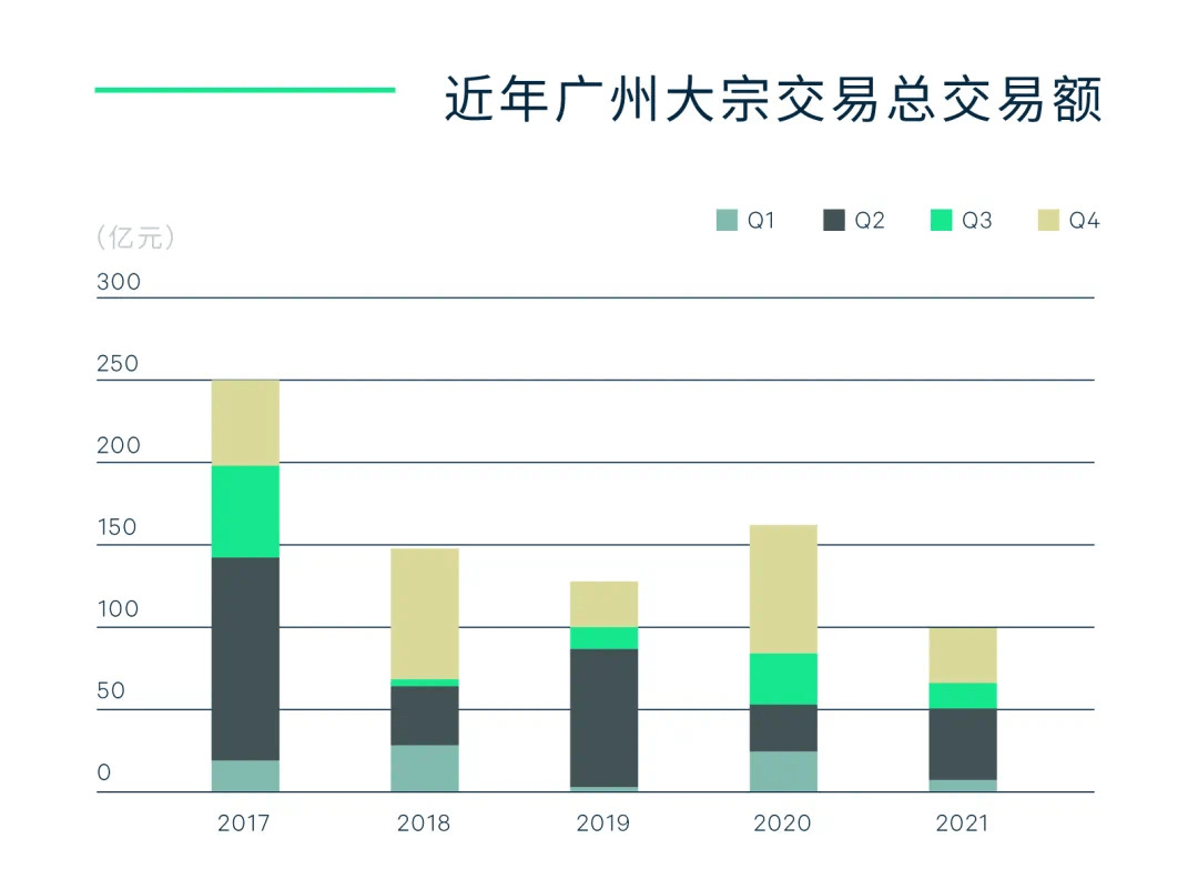 据CBRE世邦魏理仕监测,2021年最后一个季度,广州录得5宗、总成交金额为34亿元人民币的大宗物业成交,较上一季度上涨105%,但同比仍减少57%。主要成交包括一栋位于珠江新城的非优质写字楼,黄埔区一座数据中心以及富力持有的花都物流园余下的30%权益。全年录得交易14宗,总成交金额约为102亿元人民币(未统计关联交易),同比减少38%。