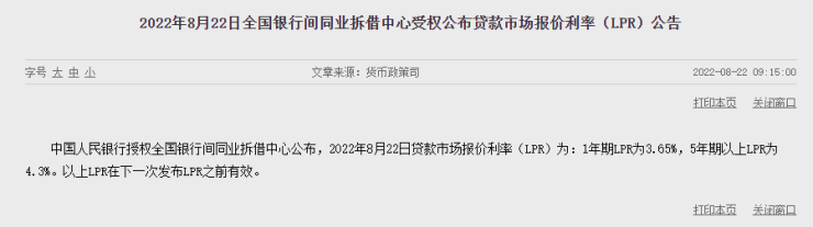 中国人民银行授权全国银行间同业拆借中心公布,2022年8月22日贷款市场报价利率(LPR)为:1年期LPR为3.65%,下调5个基点;5年期以上LPR为4.3%,下调15个基点。