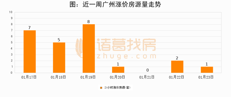 根据诸葛找房数据显示,广州24小时涨价房源量为1套,较01月22日减少1套,环比下降50%。与此同时,涨价房源占比小幅回落,对于购房者来说是一个入市窗口期,购房者可抓住时机入市。