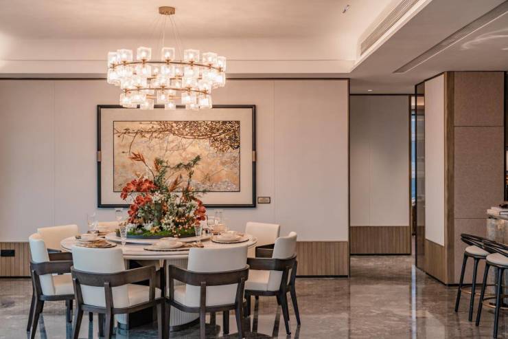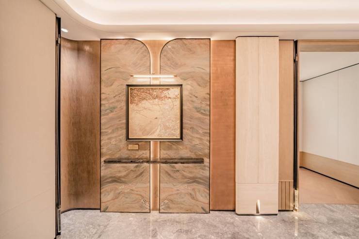设计团队以"东方礼仪"为底色,从400斤双开铸铝门上的云山珠水纹路,到玄关'丝绸之路'奢石的商脉寓意,再到壁龛玉石带的 “玉佑平安”,让归家满是仪式感。同时,团队以 Gucci Bamboo 1947系列为灵感造约70㎡环幕端厅,用超八种奢石搭配南洋风格,让东方底蕴与当代美学碰撞出惊艳质感,既呼应 “云山中轴” 基因,也赋予空间仪式与温度。