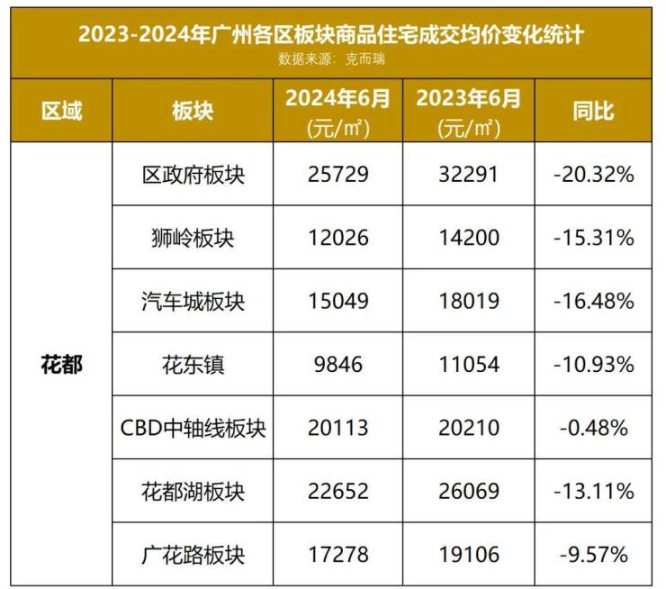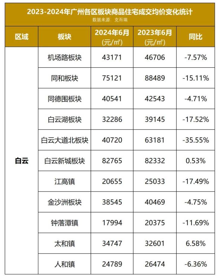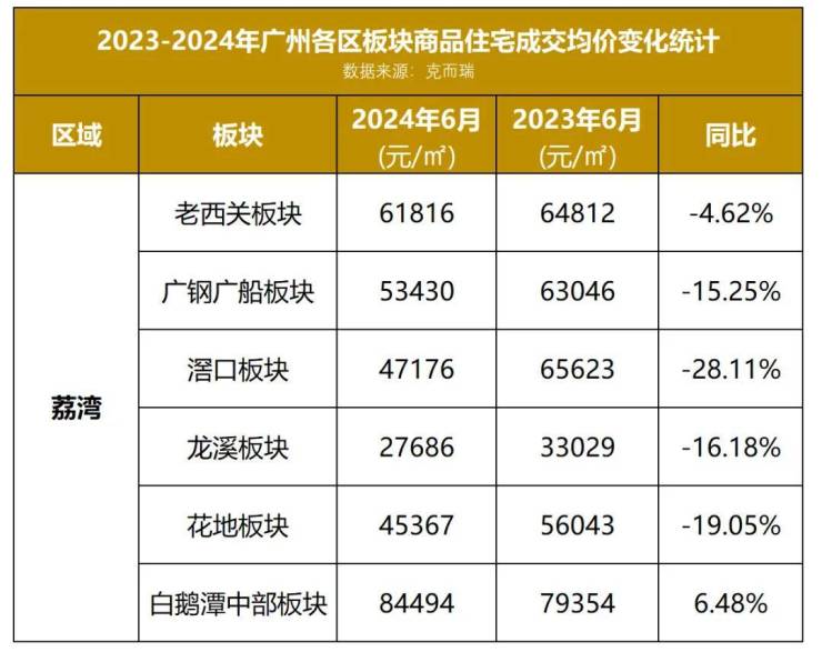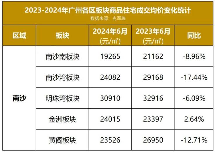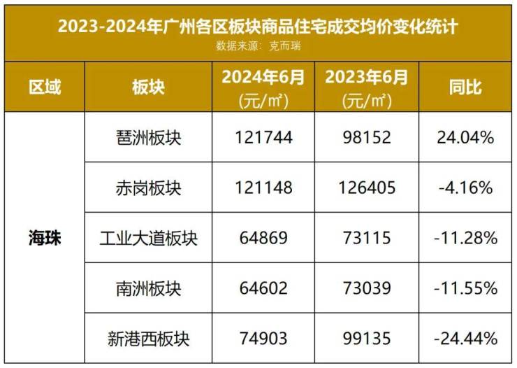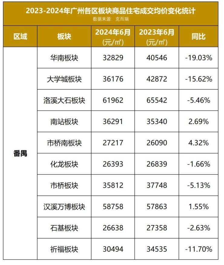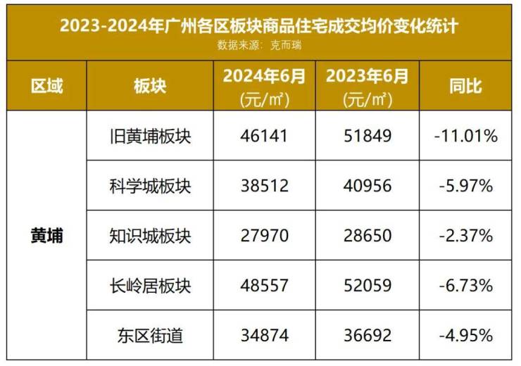 近日,小狐君最新拿到了一份2024年6月份广州各区板块住宅成交均价数据,为大家解开了广州楼市最新面貌的一角。