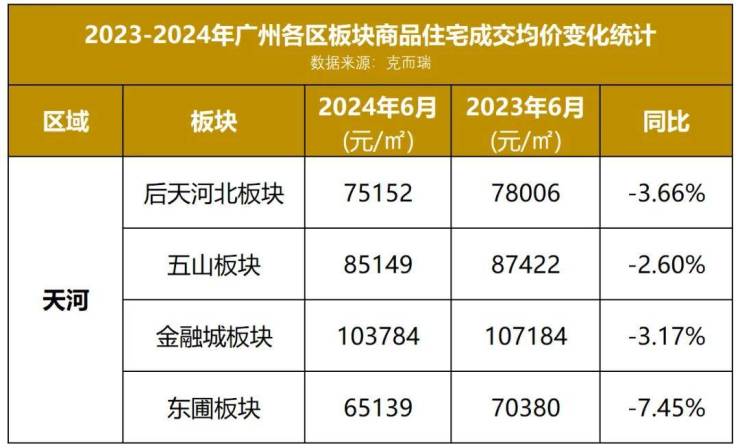 从同比涨跌情况来看,天河区4个板块住宅成交均价均出现了一定程度回落。但对比其高企的单价而言,这也算是当前市场中的正常调整。