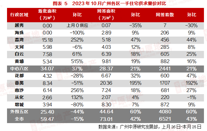 广州中原研究发展部统计数据显示,2023年内(2022.12.26-2023.10.25)广州一手住宅网签套数已达61243套,对比2022年(72936套)还存在11693套的差距。