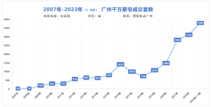 克而瑞数据显示,今年1-9月,广州千万级以上豪宅成交套数达3796套,已经超过了2022年全年的3118套。