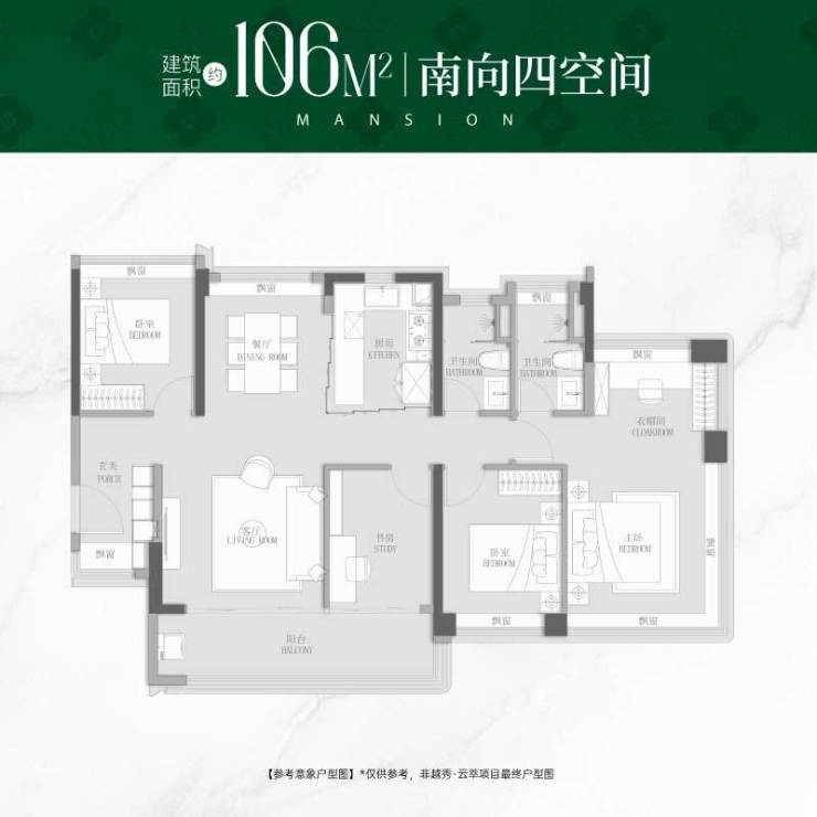 建面约107㎡的四房,拥有近15米面宽朝南、南北对流,享受充足阳光沐浴,清风无拘无束。而三面单边,约6米阳台设计,更带来了270°的无边界视野。