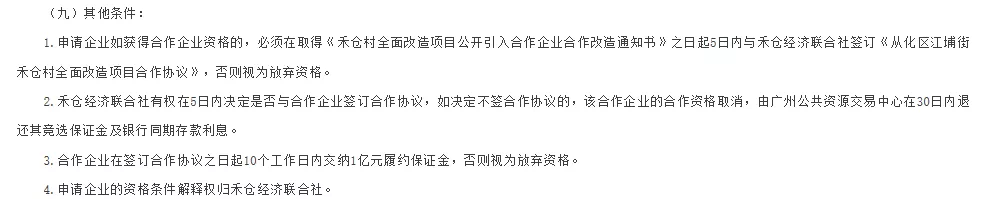 根据早期公告内容,合作企业必须在取得《禾仓村全面改造项目公开引入合作企业合作改造通知书》之日起5日内与禾仓经济联合社签订《从化区江埔街禾仓村全面改造项目合作协议》,并在签订合作协议之日起10个工作日内交纳1亿元履约保证金,否则视为放弃资格。