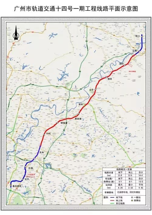 十四号线一期(嘉禾望岗至街口段)全长约54.3公里,共设13座车站,其中地下站6座(嘉禾望岗、东平、石湖、太和、江埔、街口)、高架站7座(竹料、钟落潭、黎家塘、新和、太平、神岗、邓村)。十四号线是落实广州城市“北优”战略、实现从化与城市中心区快速联系的交通线路,其功能上重点是解决从化到广州中心组团的交通需求,兼顾引导白云区、从化区沿线组团的发展。