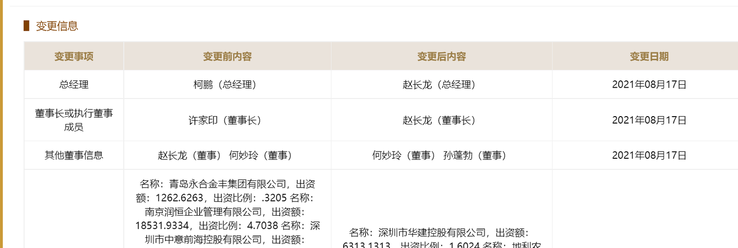 8月17日,国家企业信用信息公示系统(广东)显示,恒大地产集团更换董事长、总经理以及法人代表。许家印不再担任恒大地产董事长,柯鹏卸任总经理、法人代表等职位,新任董事长、总经理和法人代表均为赵长龙,其目前职位为恒大物业执行董事兼副董事长