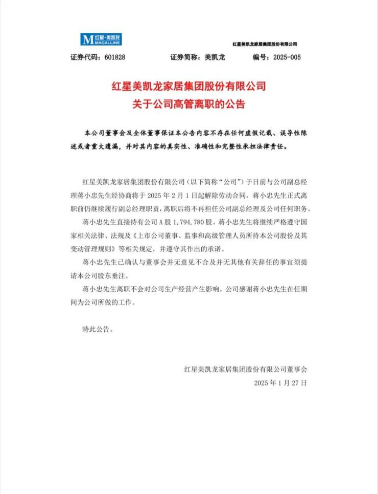 2025年1月27日,红星美凯龙家居集团股份有限公司(以下简称“红星美凯龙”)发布了一则关于公司高管离职的公告。公告显示,公司副总经理蒋小忠先生将于2025年2月1日正式离职。