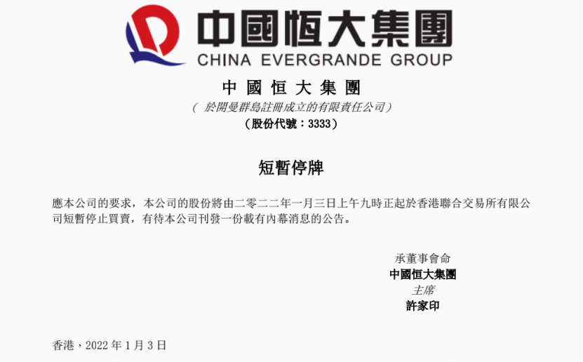 2022年1月3日,港股排名前列交易日开市交易,中国恒大(03333.HK)突然发布公告,中国恒大集团股票于1月3日9时起短暂暂停交易,具体停牌原因有待刊登进一步消息。