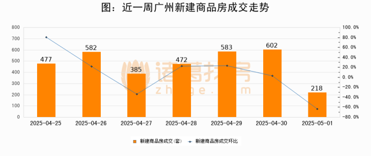 根据广州市住房和城乡建设局数据显示,2025年05月01日广州新建商品房成交218套,较昨日减少384套,环比下降63.8%。近一周广州新建商品房日均成交475套。05月01日单日成交218套,低于近一周平均水平54.1%。