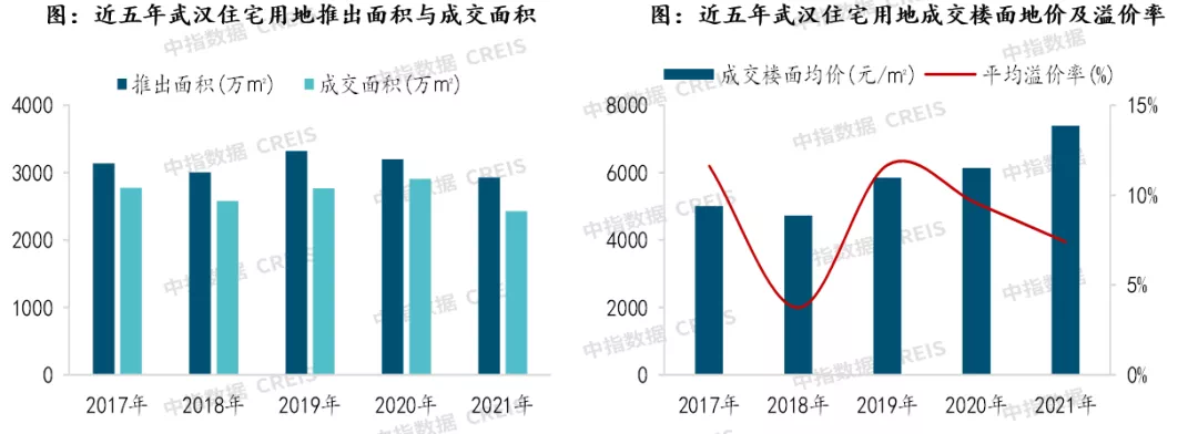 2021年,土地出让金达到1944亿元(全口径),其中住宅用地成交出让金1795亿元,在全国城市中排名第7。首批供地采取了较为宽松的土拍条件和较低的土地保证金,引起共计超百家房企关注,光谷出现溢价超过100%地块,创出地价新高;下半年,随着市场降温,土地出让基本以底价为主,接近7成地块为国资或地方平台公司所获。整体来看,2021年三批次土拍国资、地方平台托底显著,土地出让金占比超6成,民企参与前热后冷明显,民企参与也主要以勾地为主。