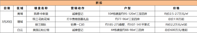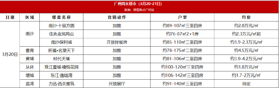 图片来源:广州天气2021年3月上半月(1-15日),广东省平均气温较常年同期偏高2.5℃。当然,热起来的不光是天气还有各楼盘的活跃度!你方唱罢我方登场,首次面市、老盘推新、现场暖场活动不断。据搜狐焦点广州站不完全统计,本周末(3月20日-3月21日)广州共8盘有营销动作,涵盖开放样板房、开放城市展厅、加推和优惠等(不涵盖暖场活动),主要分布在南沙、黄埔、番禺等区域。